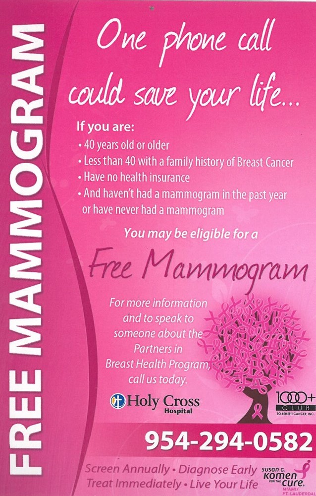 PIBH provides outreach education, clinical breast exams, screening mammograms and diagnostic procedures to uninsured, lower income and minority individuals, age 40 year and who are Broward County residents.